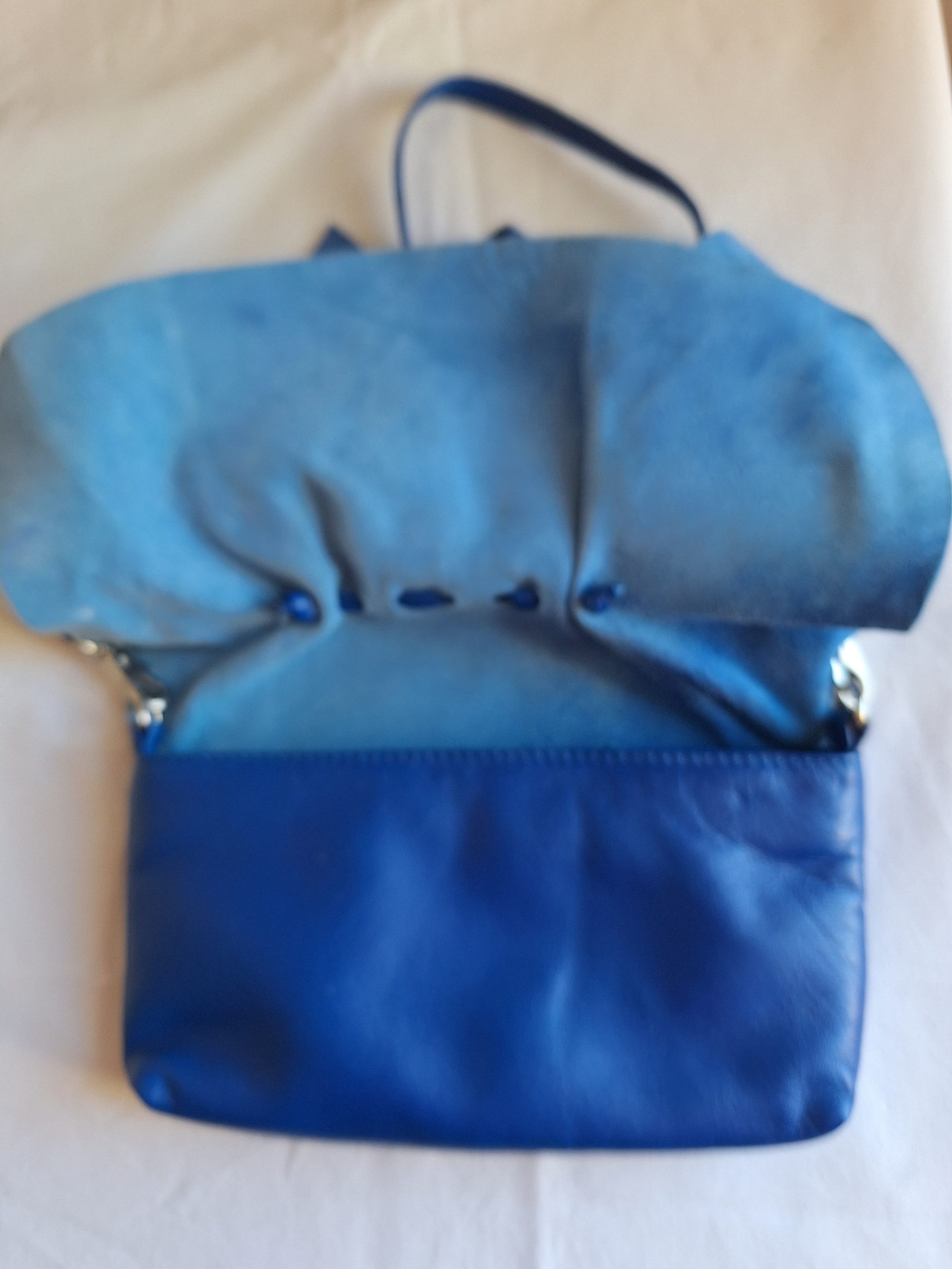 In soft blue leather, it has a single inner unlined cavity, zipped for security, a long fine leather detachable strap. It has a forward flopping flap to which is attached a single bold bow in the same colour leather!