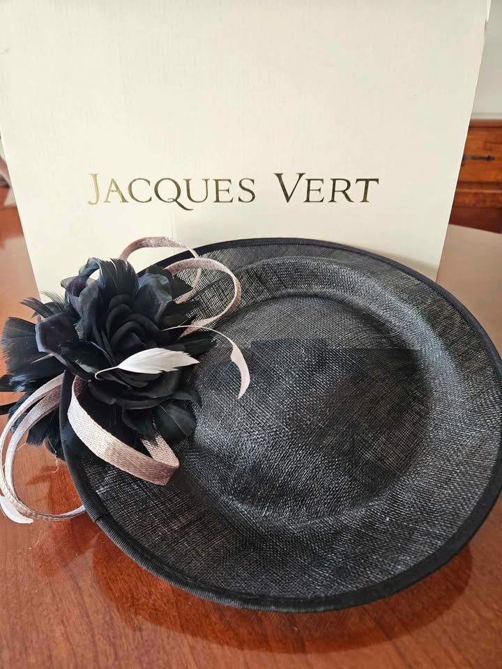 A compact fascinator from Jacques Vert, mainly in black and enhanced by taupe bands of sinamay. An angled fascinator decorated with roses above and below the main body of the item. Twirled bands of black and taupe sinamay give a contrast to the item. A headband allows secure wearing.