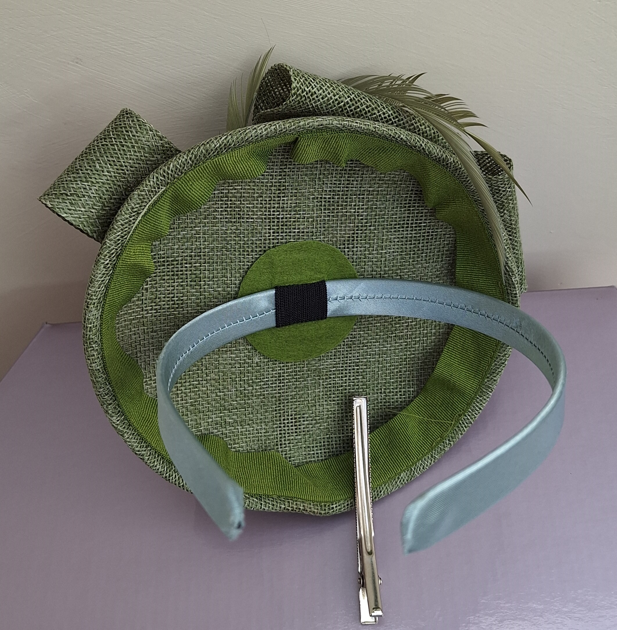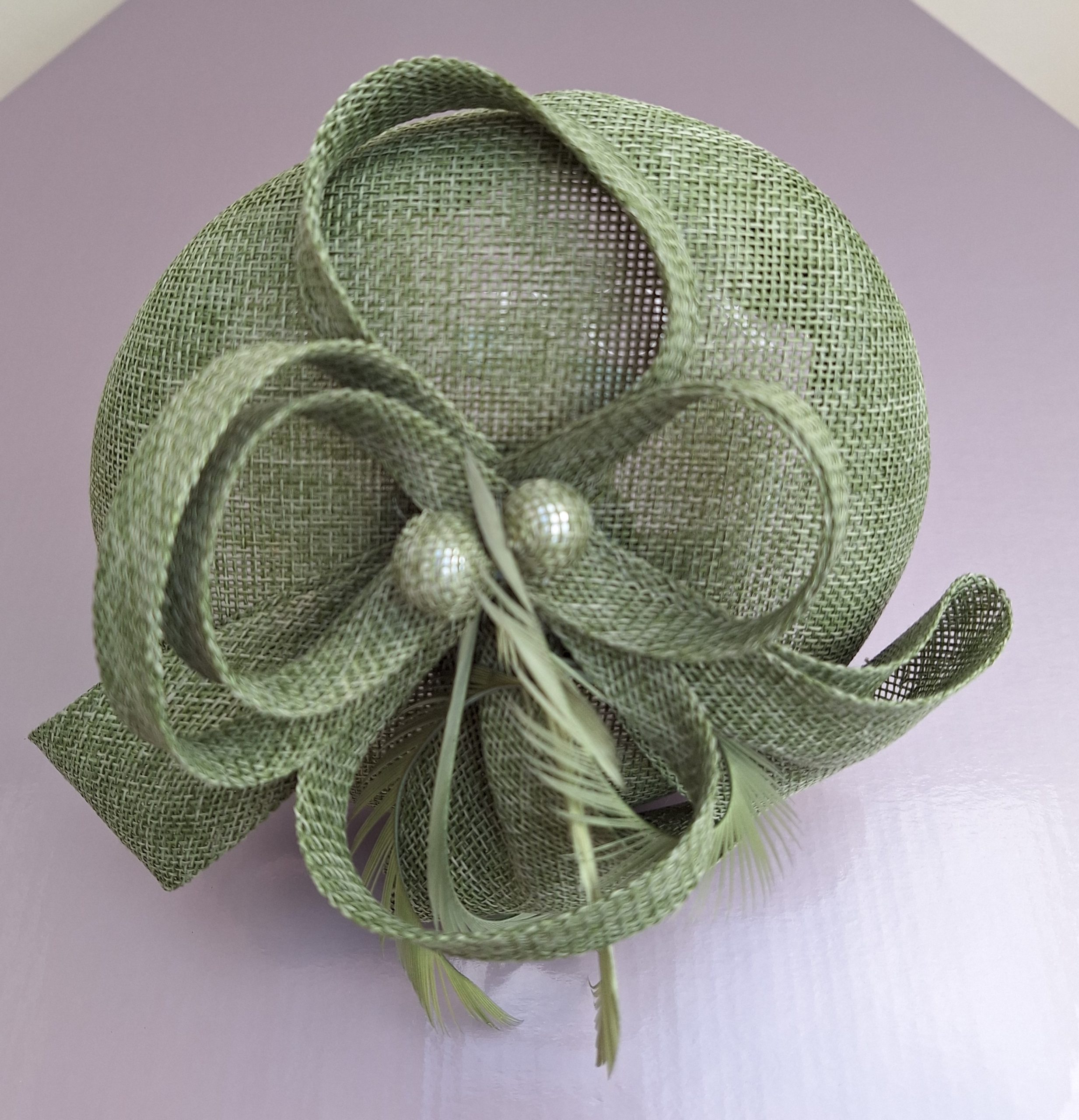 A compact sage green fascinator in a pillbox style with decoration of sinamay loops and a few feathers. Held securely in place with a headband covered in the same colour, although it can also be held in place with a hair clip as seen in second photograph. It is understated and charming.