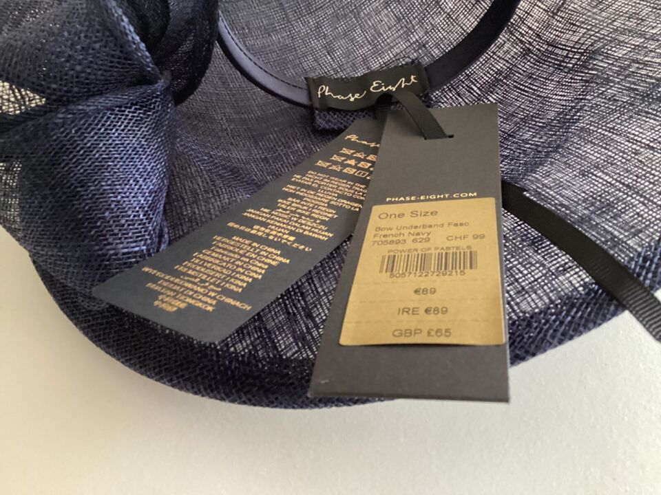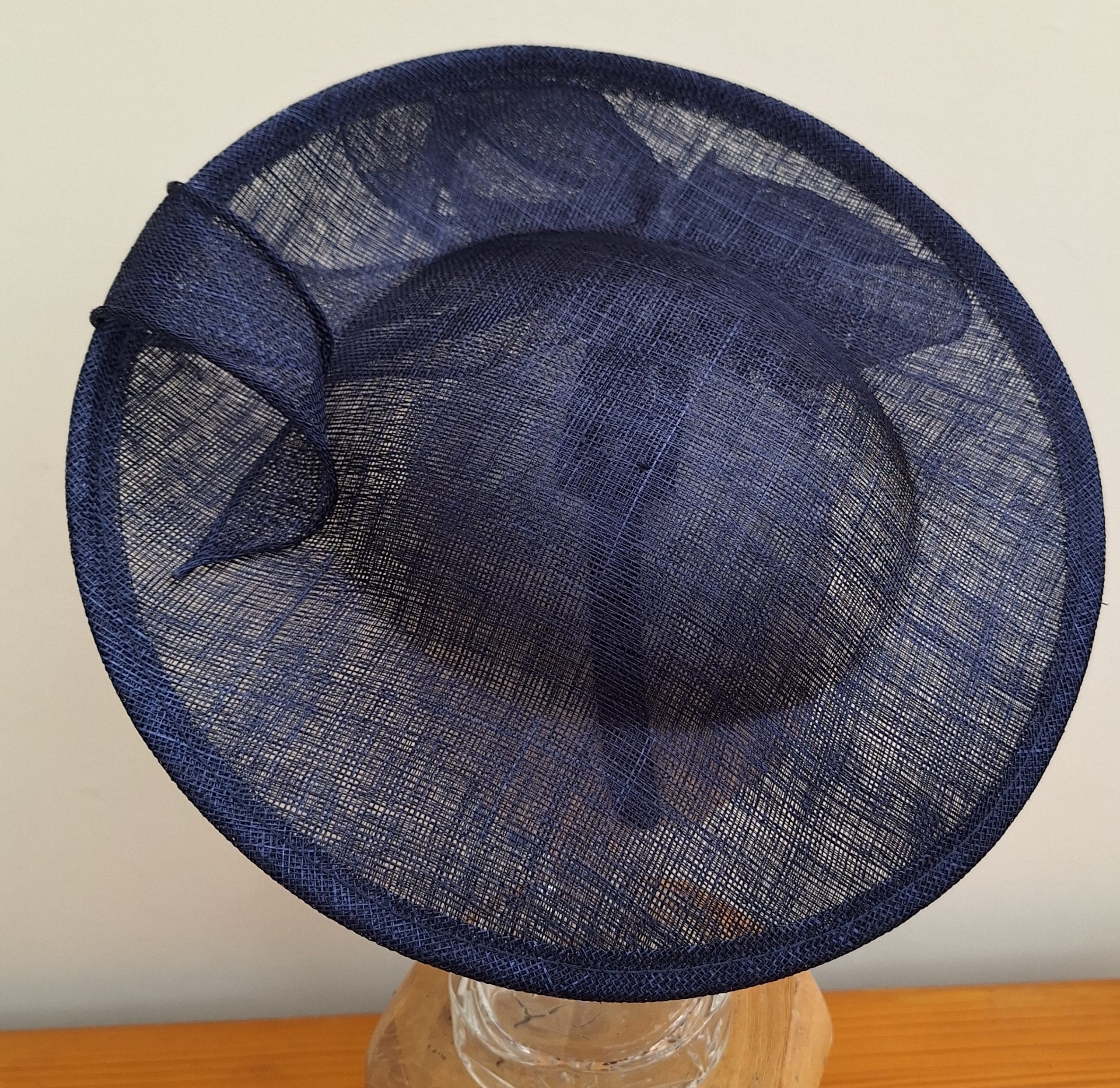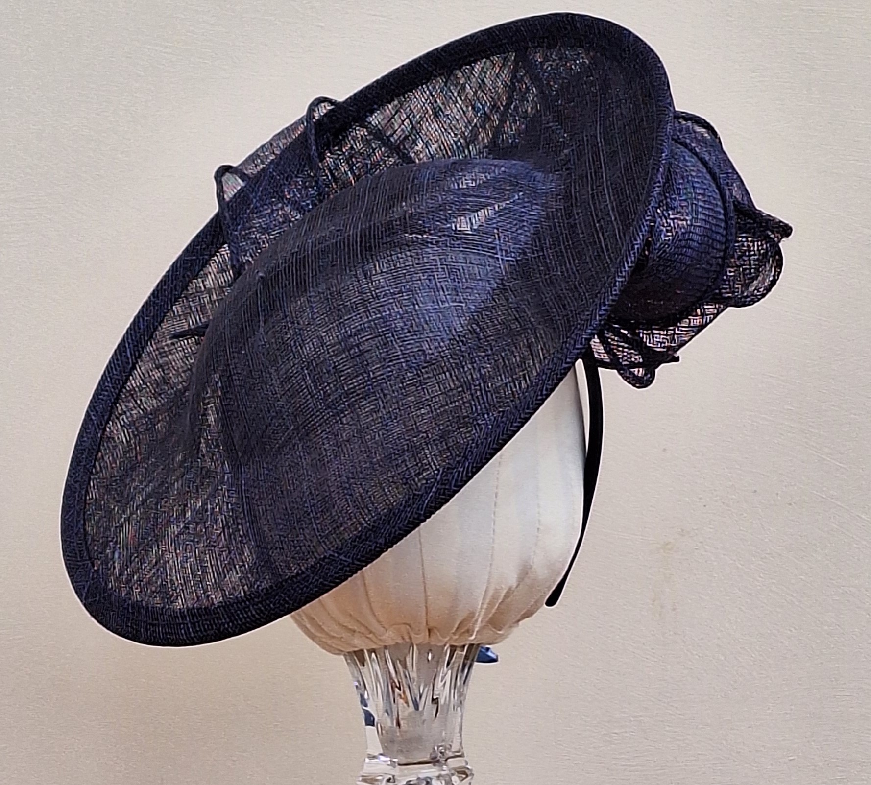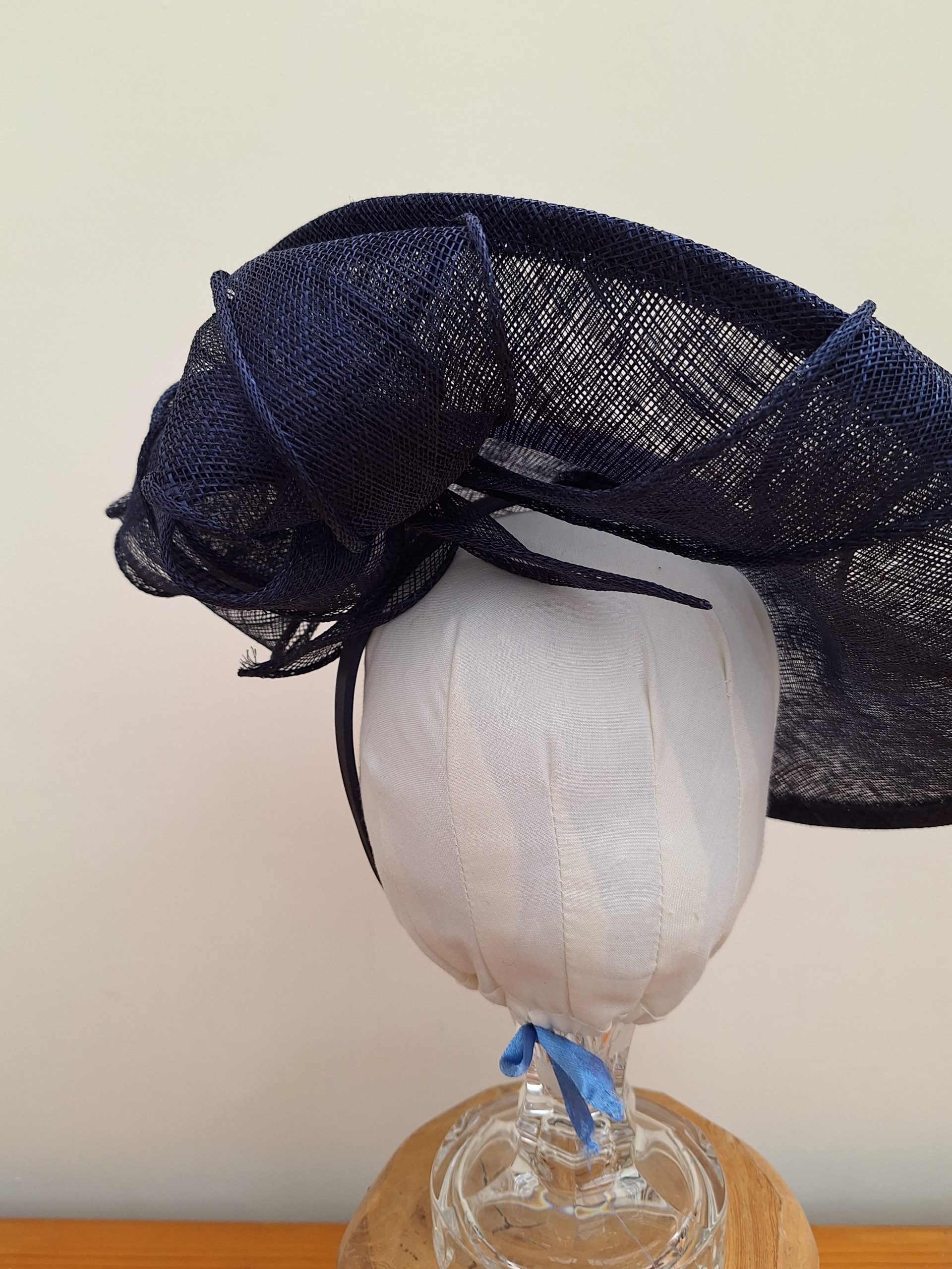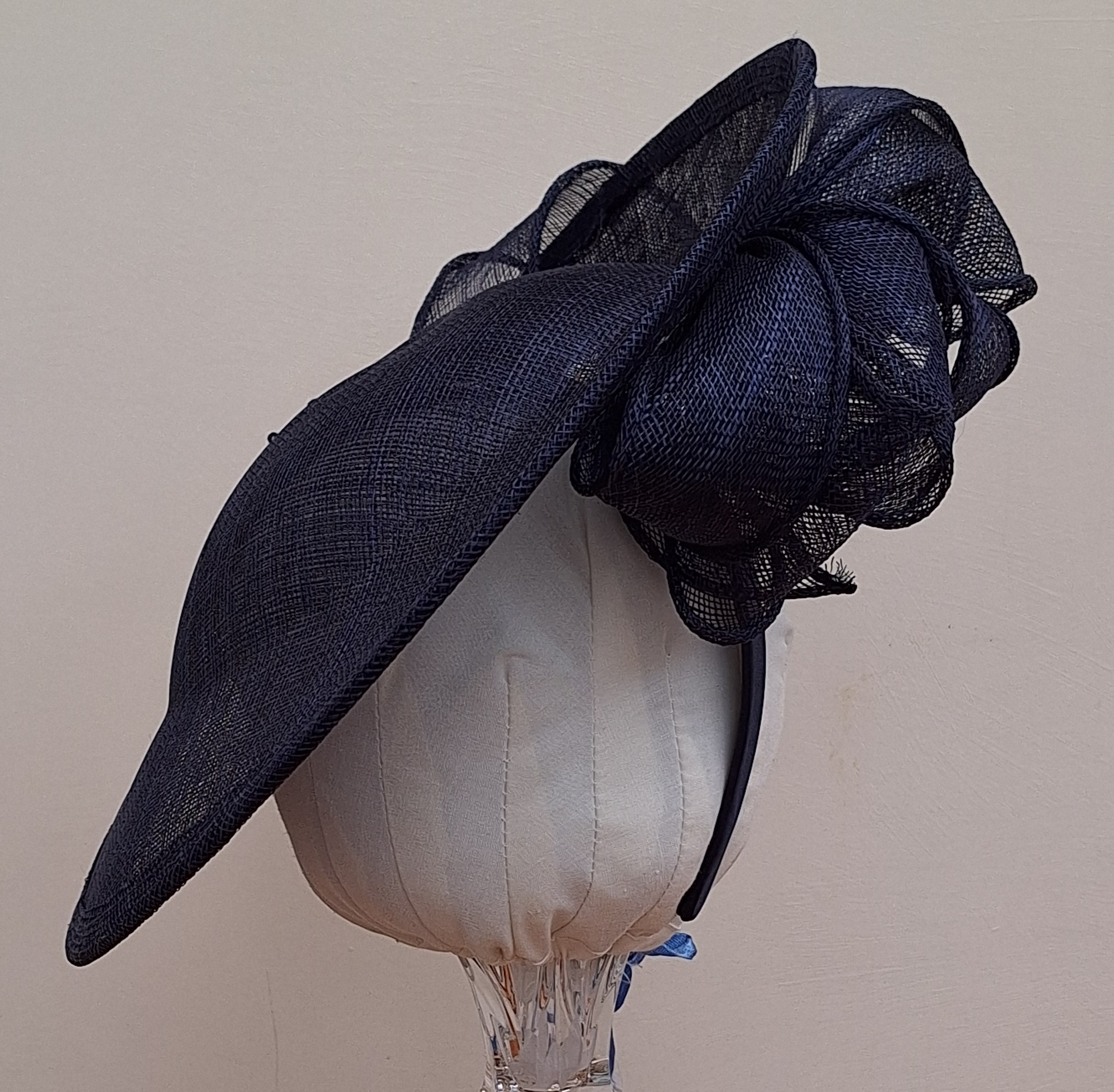 In a dark blue colour throughout, held securely in place on a headband, it sits at a sharp angle giving the wearer height and elegance. Dark blue is so versatile, coordinating with so many other shades to give a stunning overall look. What is not to like?